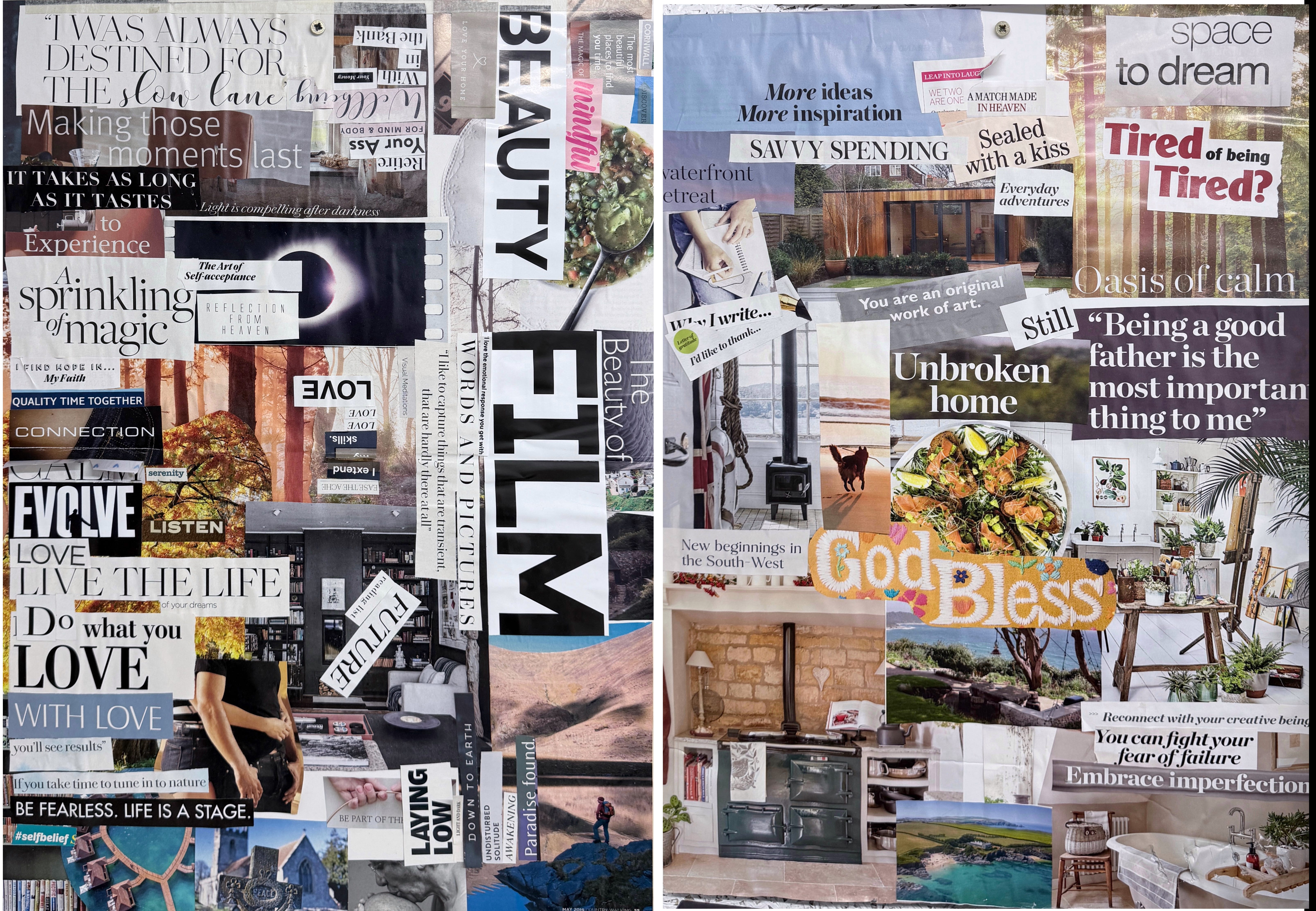 At the beginning of each year I buy lots of magazines and cut out images, phrases and words that resonate with me, that reflect my values, dreams and heartfelt desires or just ideas of what might make me a better person. I stick them on a board and hang those boards in my studio to remind me of them but also to reinforce them into my being.